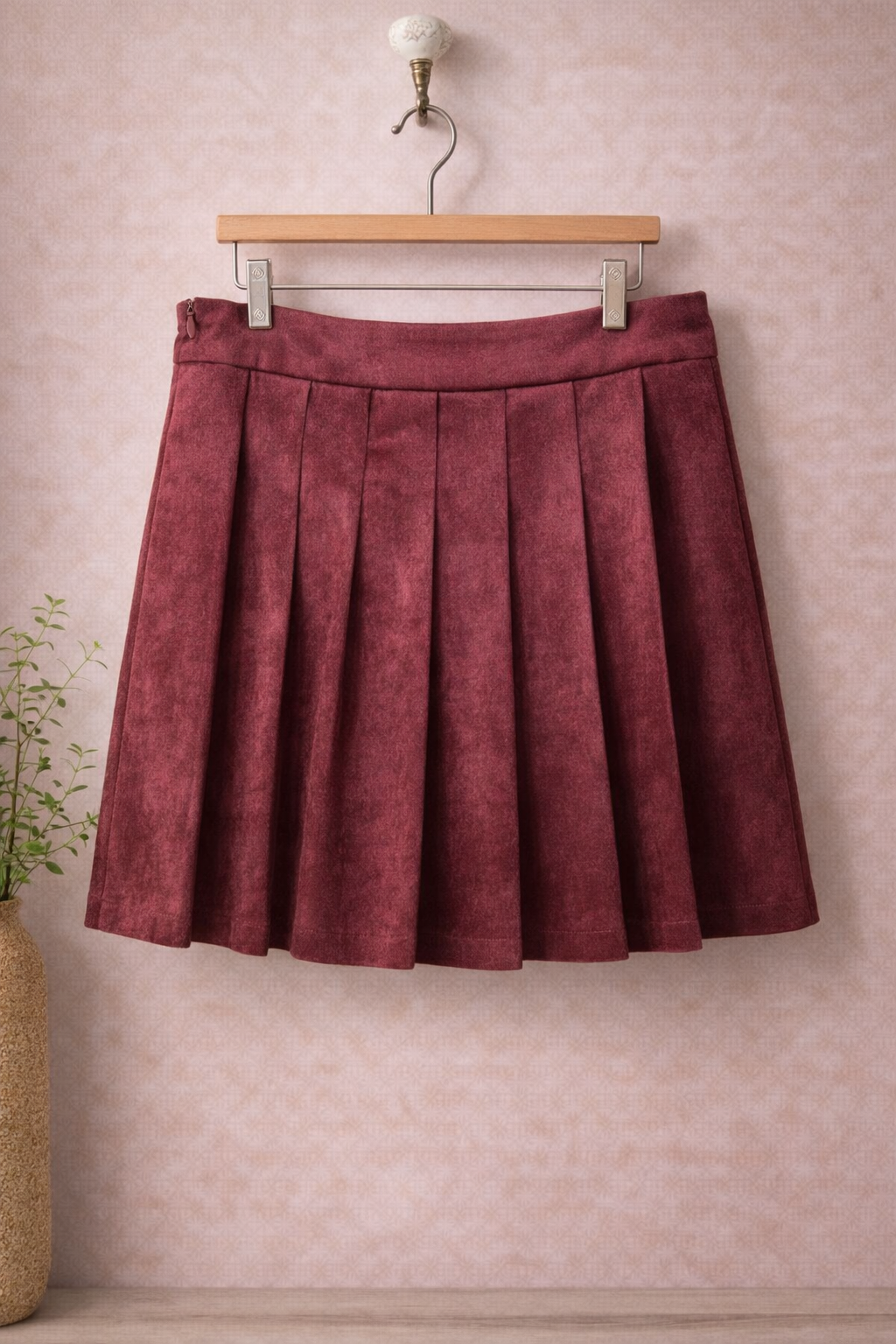 jupe courte plissé de couleur bordeaux, matière velours